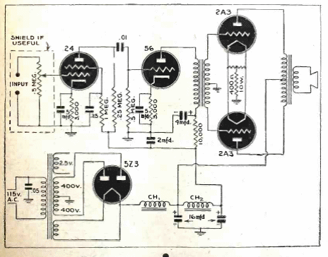 El circuito que se muestra es una configuración típica de la década de 1940. Tenga en cuenta que las válvulas triodo todavía se usaban en la etapa de potencia. Solo más tarde, con la llegada de las válvulas pentodo, estos pasos comenzaron a utilizar este tipo de válvula.