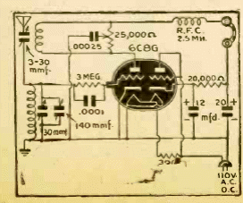Este receptor AC-DC de una válvula para escuchar auriculares de alta impedancia se encontró en una publicación de 1943. Se puede fabricar con tubos equivalentes modernos. El rango sintonizado depende de las bobinas. El circuito es del tipo regenerativo.