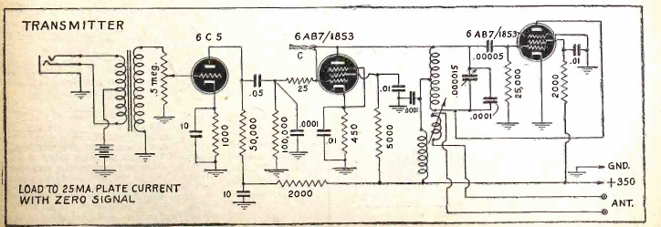 Este circuito se encontró en una publicación de 1945. Se afirmó que el circuito era parte de un walk talkie. Tenga en cuenta que, al ser un conjunto portátil, fue alimentado por baterías. El conector era para la inserción del micrófono.