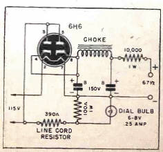 Esta fuente sin transformador se puede utilizar para alimentar una variedad de diseños de válvulas. El circuito es de una documentación de 1944. La corriente es del orden de unos cientos de miliamperes.