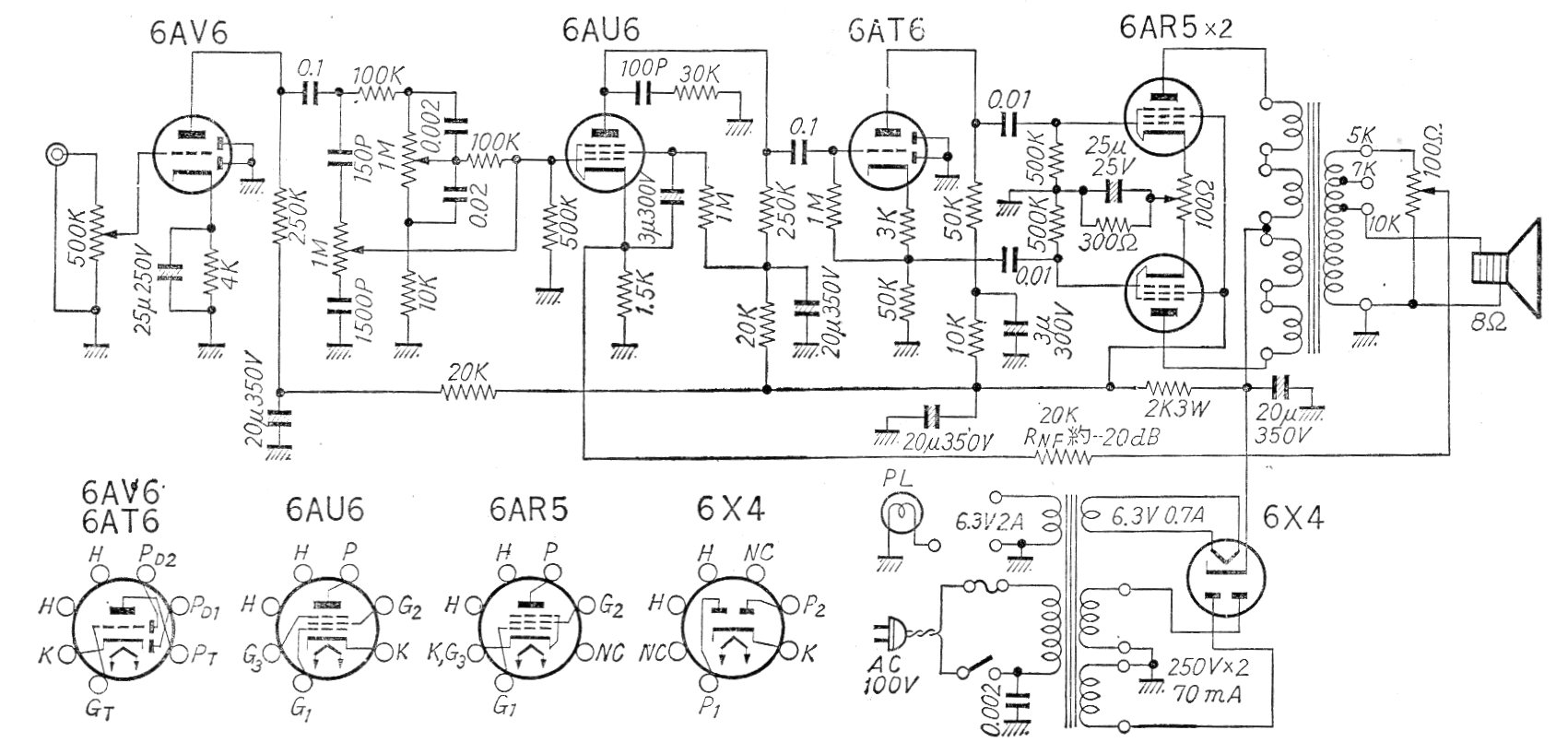 Este buen amplificador de alta fidelidad con las válvulas 6R5 en la etapa de salida fue encontrado en una publicación japonesa de los años 60. El circuito utiliza dos válvulas en push-pull en la salida e incluye la fuente de alimentación más allá de las pinzas de las válvulas.