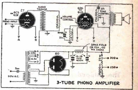 Este amplificador de fonógrafo de 3 válvulas se encontró en un Radio Craft de 1944. El circuito tiene una fuente con un transformador y produz unos pocos watts en un altavoz.