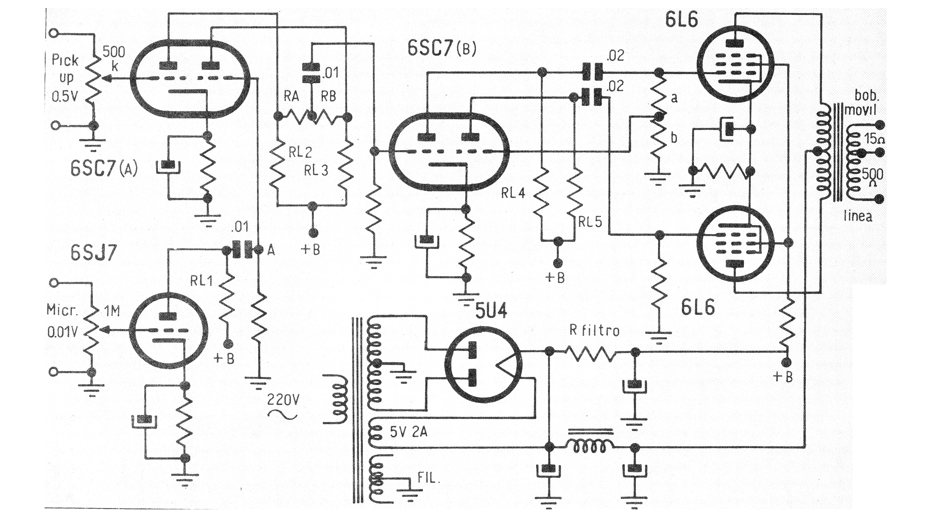 Este circuito fue obtenido en una antigua publicación argentina (sin fecha). Se trata de un amplificador que puede proporcionar una potencia de algunas decenas de vatios con excelente calidad de sonido. El transformador es de 180 a 250 V x 150 a 250 mA y los demás componentes están con los valores en el diagrama. El transformador de fuerza y de salida son los componentes críticos del proyecto.