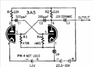Si bien este antiguo circuito utiliza una válvula 3A5, se puede elaborar con dobles triodos más comunes, como la 12AX7, 12AU7, etc e incluso dos 6C4 u otras. El circuito genera señales rectangulares cuya frecuencia depende de los condensadores y de R3 / R4. La alimentación en este ejemplo es hecha por baterías, pero se pueden utilizar fuentes.
