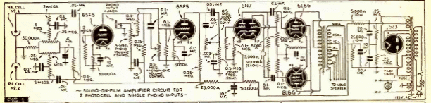 Indicado para sistemas de sonido en ambientes grandes como cines, este circuito de 1941 usaba 6 válvulas y tenía buena potencia. La fuente era de tipo transformador y el circuito tenía dos entradas pero la amplificación era monofónica. La salida de contrafase proporcionó una buena potencia de audio.