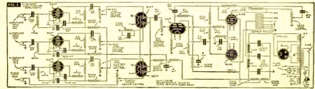 Este amplificador mezclador de 3 entradas se encontró en una publicación de 1841. El circuito estaba indicado para sonido ambiente, por ejemplo, en un conjunto con caja amplificada de 3 entradas. El circuito tiene buena potencia con válvulas pentodo en contrafase a la salida. Sirve como referencia para la restauración.