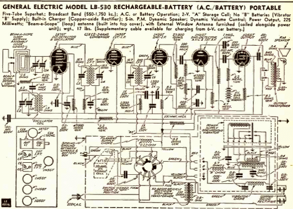 Interesante idea de receptor comercial de 1941. El circuito de onda media de 5 válvulas se alimentaba tanto de la red eléctrica como de baterías recargables con circuito de recarga. La antena era de cuadro y la FI de 455 kHz. Se obtuvo una buena salida de volumen de un altavoz.