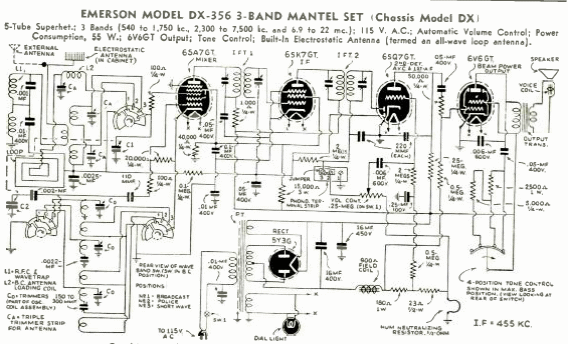 Este receptor comercial de 3 bandas es de la década de 1940. Con 5 válvulas se alimentaba de red con excelente sensibilidad. La configuración se hizo común en los receptores durante años después de ese momento debido a su simplicidad y sensibilidad. Tenga en cuenta el uso de un transformador en el suministro con una válvula rectificadora de onda completa.