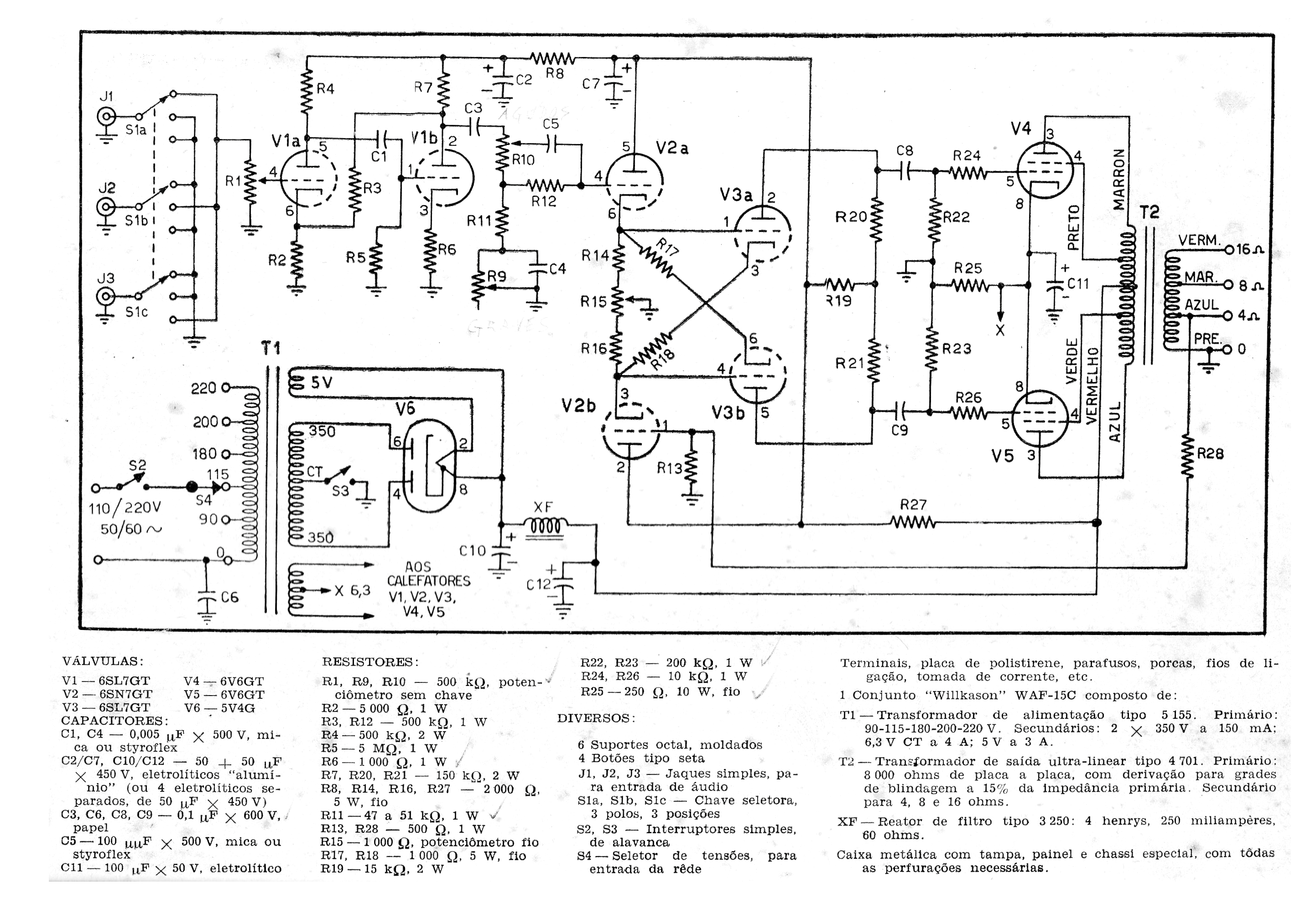 Este circuito de amplificador de alta fidelidad es de una publicación de 1957, siendo desarrollado por el propio fabricante de los transformadores, Willkason, que ya no existe. Así, en el montaje, los componentes críticos, además de las válvulas, son los transformadores y el choque de filtro de la fuente. Observe la excitación de la etapa en contrafase con válvulas inversoras de fase (V2 y V3).