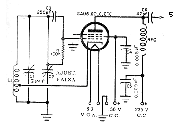 Los osciladores de frecuencia variable – OFV (VFO en inglés) son circuitos importantes para transmisores de radioaficionados y varios otros tipos. Generan la señal que, amplificada y modulada, da como resultado la señal final que será transmitida. El circuito que presentamos a continuación se obtuvo de una publicación de 1967. La bobina depende del rango de frecuencia deseado, típicamente: 30 + 30 vueltas de cable 28 en forma de 2 cm para la banda de 7 MHz 15 + 15 vueltas para la banda de 15 MHz La energía puede provenir de una de las fuentes mostradas en el artículo V009 y RFC es un choque de 2, 5 mH o. más. El condensador variable es el tipo que se encuentra en los equipos de válvulas y los condensadores deben estar hechos de mica o cerámica.