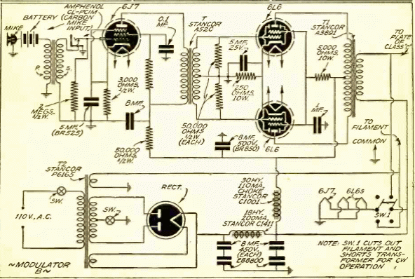 Este circuito de alta potencia se encontró en un Radio Craft de 1941. El circuito tiene una salida push-pull y está indicado para transmisores de unos pocos cientos de watts modulados en amplitud. Los componentes, principalmente transformadores e inductores, son acordes a la potencia del circuito.