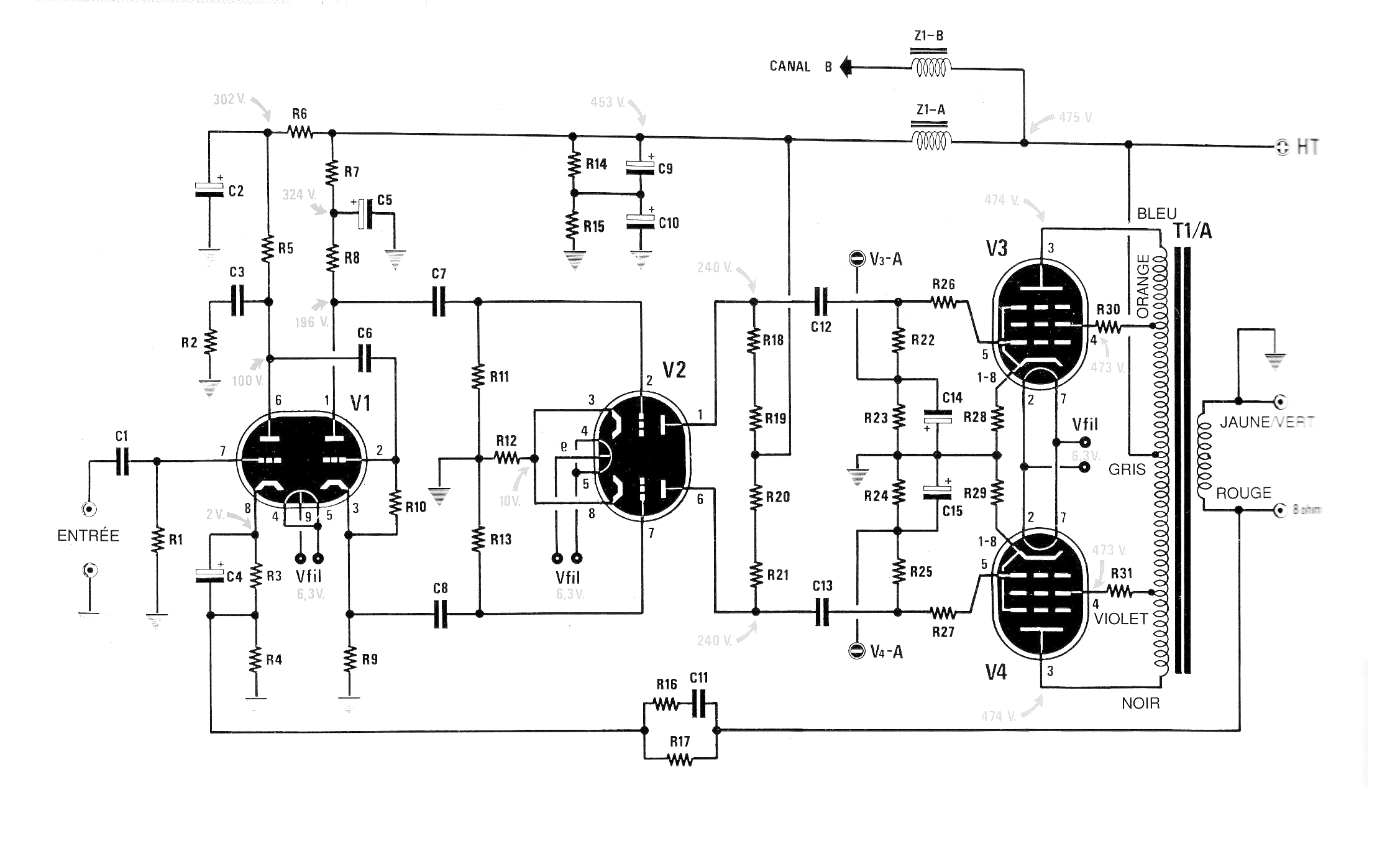 Este excelente amplificador de alta fidelidad se obtuvo en una revista Nouvelle Electronique de Francia, una edición de 1994. La fuente está en V235. El circuito tiene por elementos críticos además de las válvulas son los transformadores los choques de filtro. Utiliza un doble triodo como inversor de fase eliminando así la necesidad de un transformador controlador. Observe las altas tensiones que deben ser medidas en los diversos puntos del circuito.