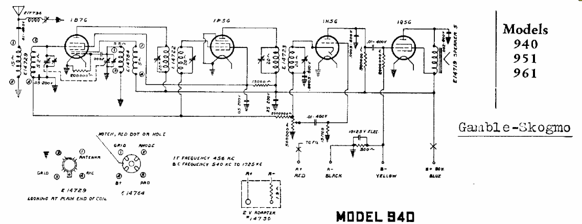 Este circuito es sólo del receptor, no siendo dada la fuente de alimentación que puede ser una común con tensiones de 120 a 250 V y una baja tensión para los filamentos de las válvulas. El circuito es para una banda de onda del tipo superheterodino.