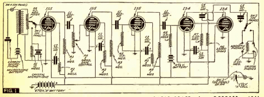 Destinado a aplicaciones de audífonos, este circuito se encontró en una documentación de 1941. Hay 5 válvulas ultraminiatura de la época con un filamento de 1 V. La salida es de unos pocos miliwatts para usar en auriculares. Todavía se usaban dos baterías, una de las cuales era de alta tensión.