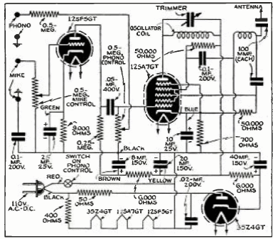 Este circuito de una publicación de la década de 1940 transmite las señales de un tocadiscos mono de la época a una radio de onda media cercana. La antena es un trozo de alambre de 1 a 3 metros y el alcance puede llegar a unas pocas decenas de metros. La bobina oscilante tiene un primario de 100 vueltas y un secundario de 10 vueltas en un tubo de cartón o PVC de 1,5 a 2 cm de diámetro. El circuito se alimenta directamente de la red sin necesidad de transformador.