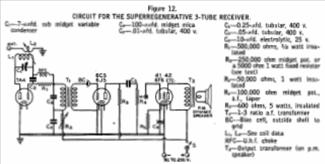 Este receptor para el rango de VHF fue obtenido en el Radio Handbook, edición de 1940. Además de los transformadores y bobinas, las válvulas son los elementos críticos para un montaje. Vale más como curiosidad que para pensar en su realización práctica. Observe la simbología utilizada para representar las válvulas triodo.