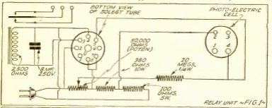 Este relé fotoeléctrico se encontró en documentación de 1941. Hace uso de un tipo de válvula o tubo fotoeléctrico que era común en ese momento. El circuito es alimentado directamente por la red eléctrica. El relé es un tipo de bobina de alta tensión y baja corriente.