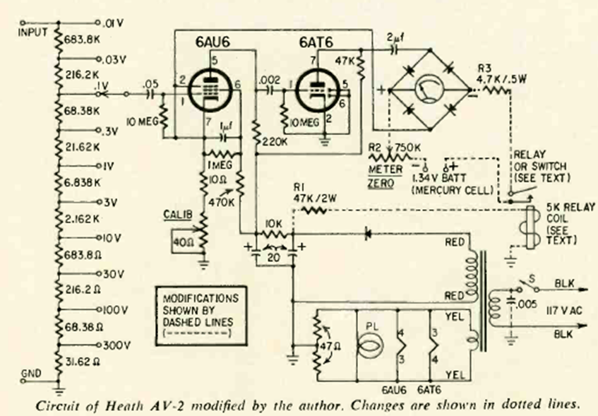 Este es el circuito de un kit Heathkit modificado. El circuito fue encontrado en una Radio Electrónica de diciembre de 1965. El autor del circuito incluyó mejoras al circuito original.