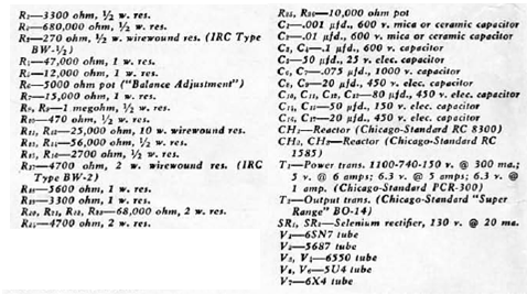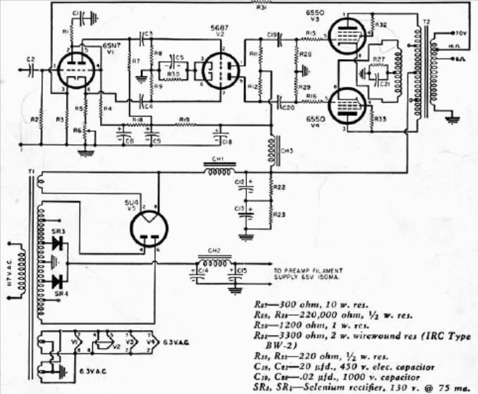 Este amplificador de 100 W es de una publicación de 1955. Los componentes críticos además de las válvulas son los choques de filtro y los transformadores. El circuito tiene salida en contrafase con excelente calidad de sonido. Los diodos pueden ser los 1N4004.