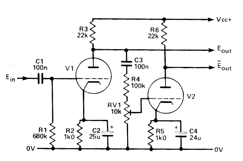 Este circuito se destina a la inversión de fase de una señal de audio para obtener la excitación de etapas de potencia en push-pull sin la necesidad de un transformador. El circuito utiliza válvulas como la 12AU7, 12AX7, etc. que son dobles triodos. Hemos obtenido este circuito de una antigua publicación de 1989. La tensión de alimentación varía entre 250 y 350 V típicamente.