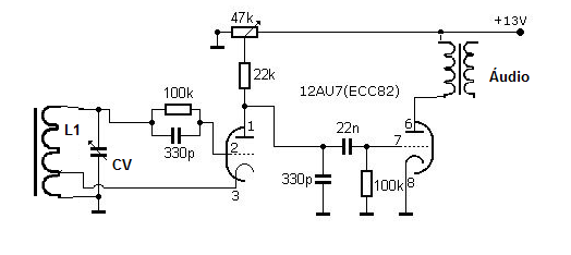 Este circuito utiliza un doble triodo 12AU7 o aún 12AX7 para recibir señales de la banda de ondas medias. El circuito es alimentado por baja tensión, teniendo en la salida un transformador del tipo encontrado en radios valvulados. Podemos alimentar tanto un auricular de baja impedancia como un altavoz. La bobina está formada por 20 + 80 espiras de hilo esmaltado de 26 a 30 en un bastón de ferrita y CV es un condensador variable obtenido de una radio AM para uso. La alimentación se puede realizar con tensiones de 12 a 13 V.