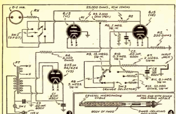Este circuito de instrumento de banco se encontró en una documentación de 1941. El circuito de 3 tubos era en realidad un voltímetro electrónico con una impedancia de entrada muy alta. La energía fue suministrada por la red eléctrica a través de una fuente con transformador, para mayor seguridad.