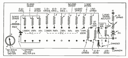 En la figura tenemos un circuito de prueba universal que se muestra en una publicación de 1940. Es un circuito útil que todavía se puede construir hoy si desea aprovechar un instrumento de bobina móvil sensible. La selección de pistas se puede hacer mediante puentes o, si puede encontrarlo, un interruptor selector. Una idea interesante para utilizar componentes de desecho.