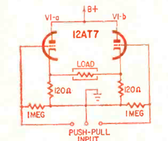 Esta etapa consta de un amplificador diferencial con salida de baja impedancia a través del cátodo. La fuente de alimentación depende de la válvula y la carga típica es de 120 ohms.