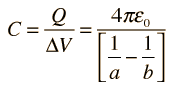 Podemos escribir una fórmula que diga cuál es la capacitancia dependiendo de la distancia entre las armaduras al centro de la esfera: