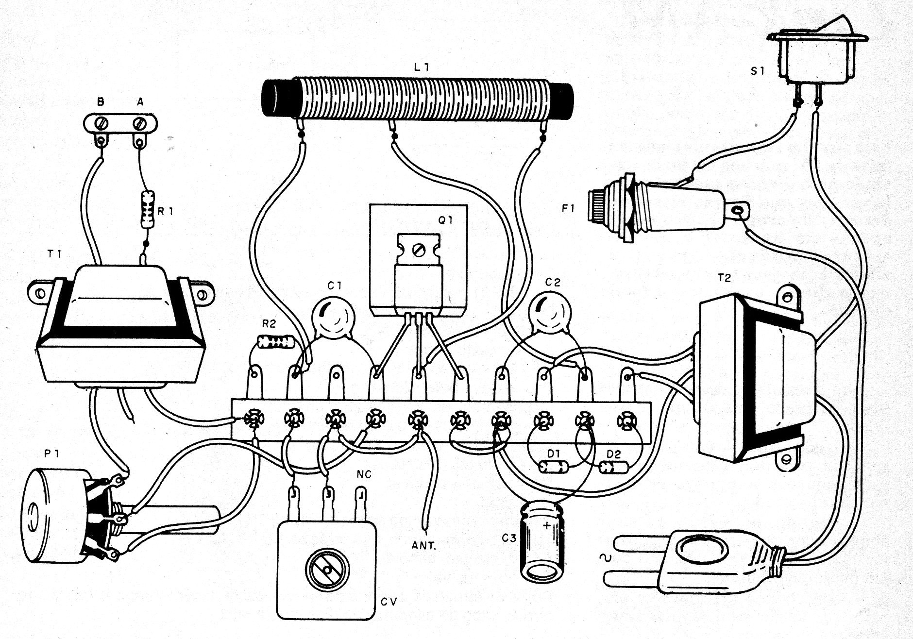 El transformador T1 de modulación es un transformador con secundario de 6 + 6 V y corriente de 250 mA o más.