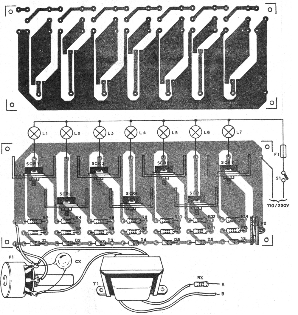 Este circuito hace que un conjunto de lámparas incandescentes formando una barra parpadeante acompañando el sonido de un amplificador. El circuito puede ser utilizado en salones de fiestas, conjuntos musicales y teatro.