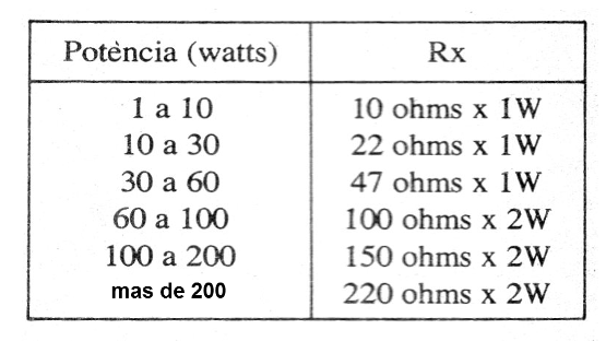 En el secundario de baja tensión debe ser conectado un resistor que depende de la potencia del amplificador, conforme la tabla dada a continuación.