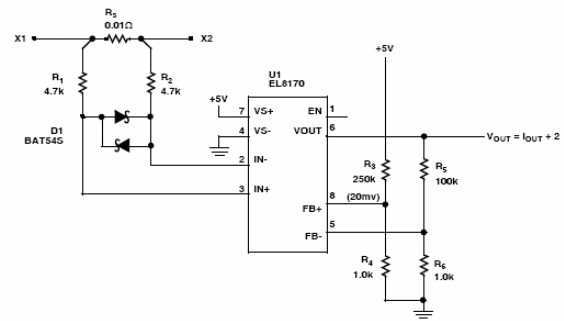 Este circuito puede monitorear corrientes hasta 2 A en ambos sentidos, cuando entonces la tensión de salida variará entre 0 V (a -2 A) hasta +4,0 V (a +2 A).