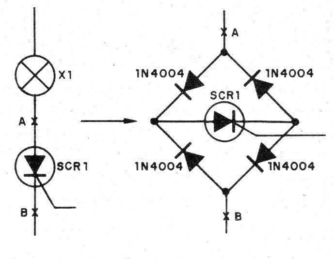 Para un control de onda completa hasta 100 W de lámparas se puede utilizar un puente rectificador con cada SCR con la configuración mostrada en la figura 4.