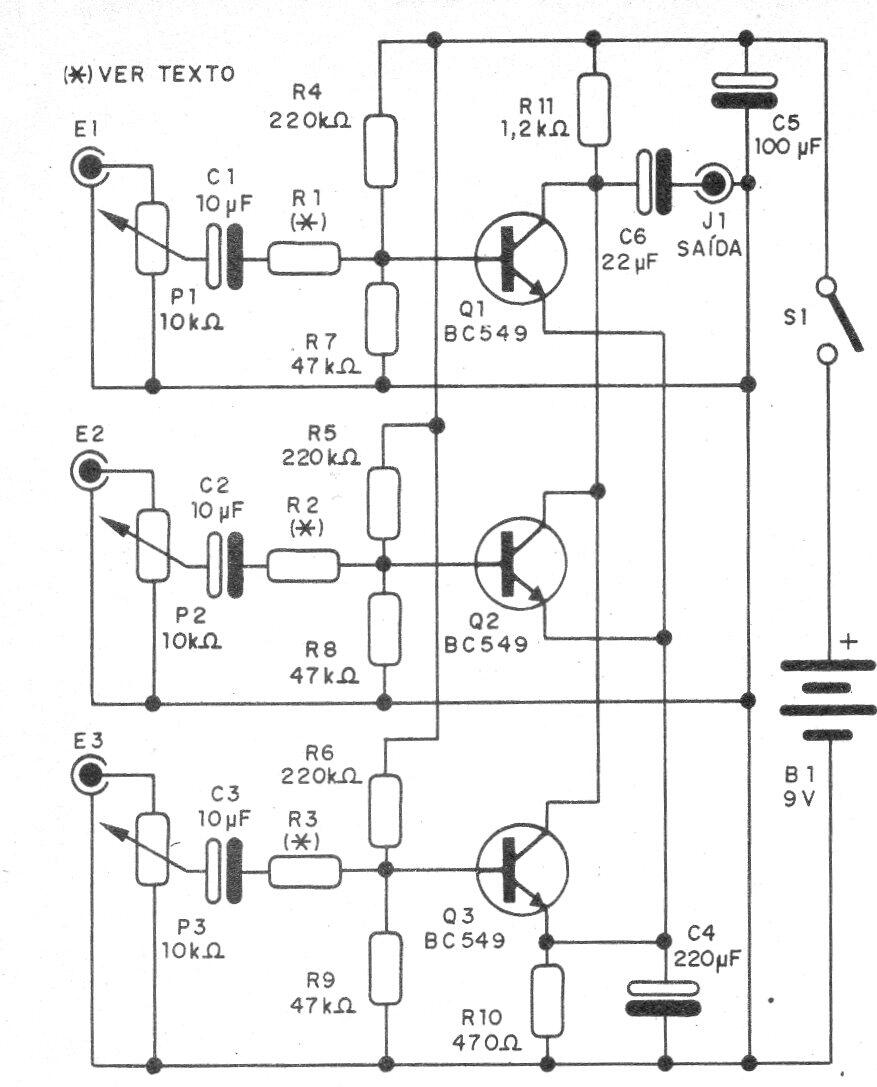 Para fuentes de alta impedancia R1, R2, R3 tendrán valores entre 10k y 50k y para fuentes de baja entre 1k y 4k7.