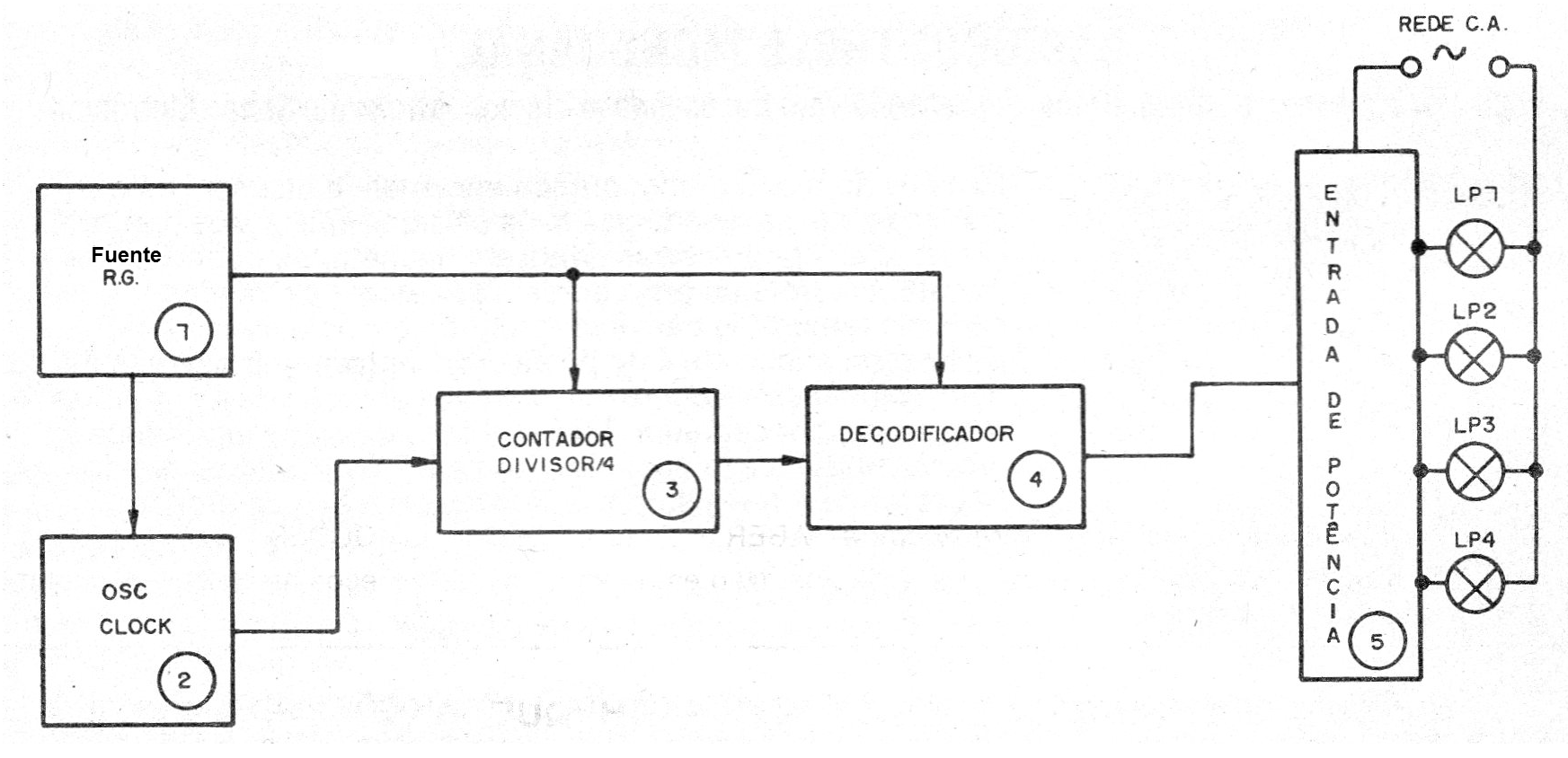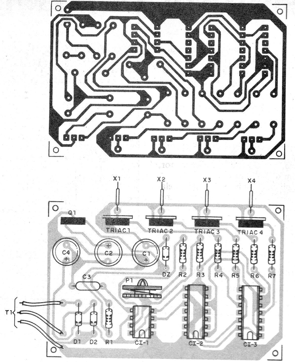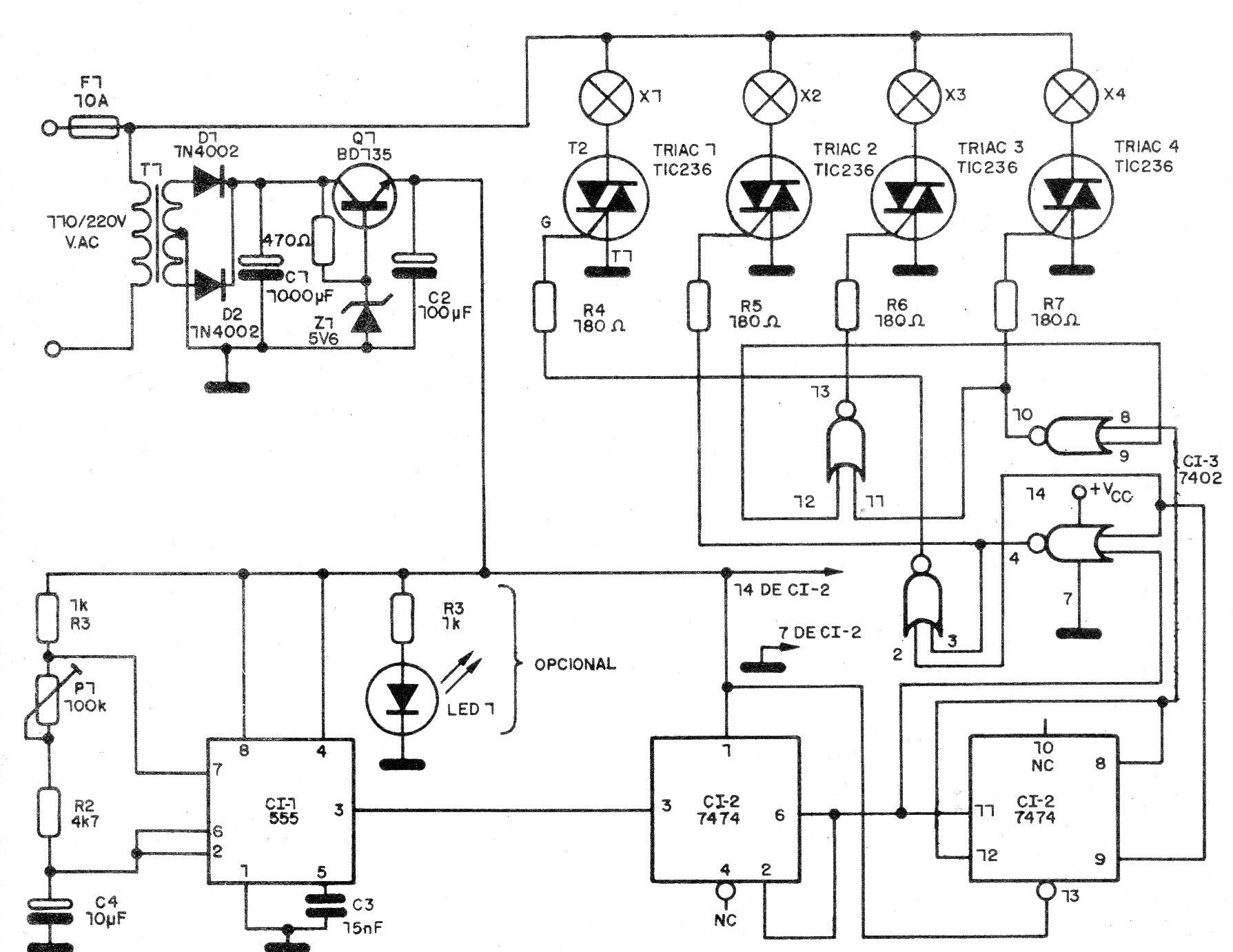 Este circuito TTL de 4 canales utiliza triacs para accionar cuatro conjuntos de lámparas incandescentes con una potencia máxima de 1 000 W en la red de 110 V. El circuito no presenta dificultades para el montaje, pues los componentes utilizados son comunes.