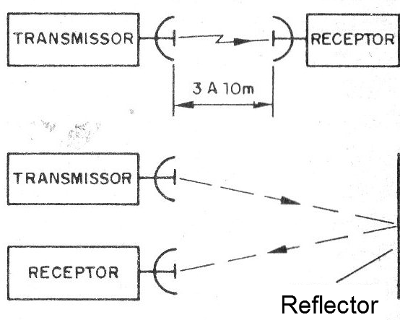 En el segundo hay un reflector para las señales y tanto el transmisor como el receptor se encuentran próximos. El reflector puede ser de chapa de aluminio o una malla de alambre.