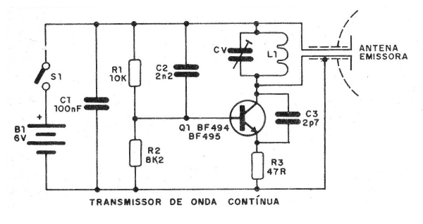 El transmisor consiste en un simple oscilador con único transistor que funciona entre 200 y 400 MHz (cuanto mayor sea la frecuencia, mejor). El transistor BF494 o BF495 puede operar bien en estas frecuencias, pero si quieres experimentar en frecuencias más altas, puede tratar de otros como BF979 y BF689k, utilizados en osciladores de UHF.