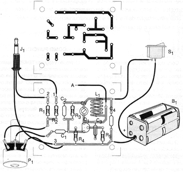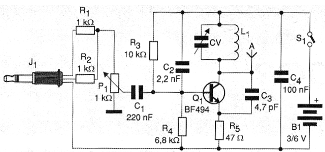 La base del circuito es un oscilador de baja potencia con un transistor NPN de alta frecuencia BF494 o equivalente (BF254, BF495, 2N2222, etc.). En este circuito, la frecuencia de operación es dada por el circuito resonante L1 / CV. En CV ajustamos la frecuencia para un punto libre de la banda de FM.