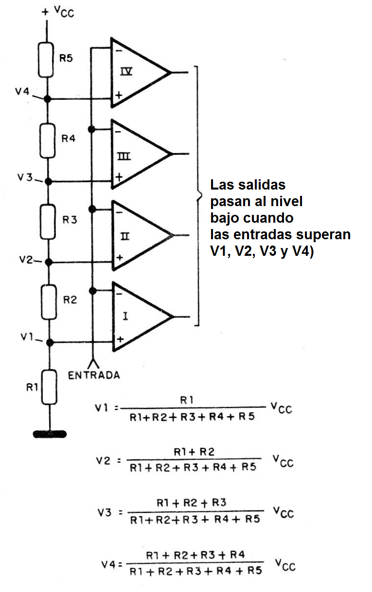 Al conectar a las entradas de cuatro comparadores de tensión, como referencia, un divisor escalonado, cada comparador tendrá su salida conmutada con una tensión ligeramente superior a la que conmuta el anterior.