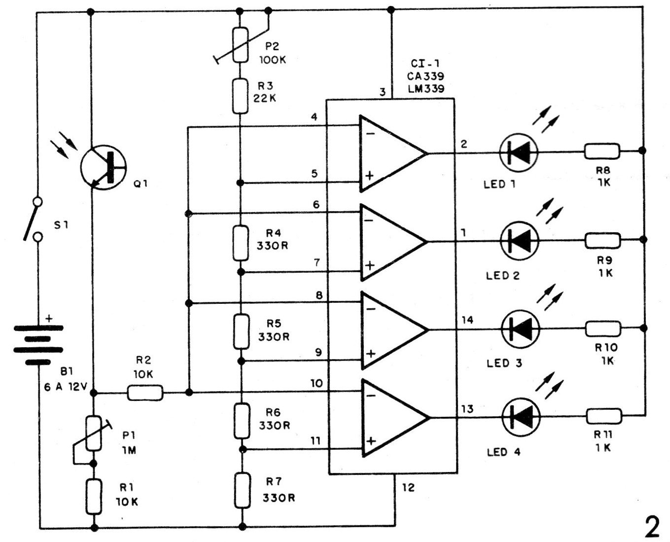 Fijando en tres LEDs encendidos el nivel normal, sabremos que el encendido de los cuatro significa que el límite ha sido superado, y que el encendido de dos de ellas, de apenas uno, o incluso de ninguno, significa la disminución del nivel de iluminación o el corte de energía.