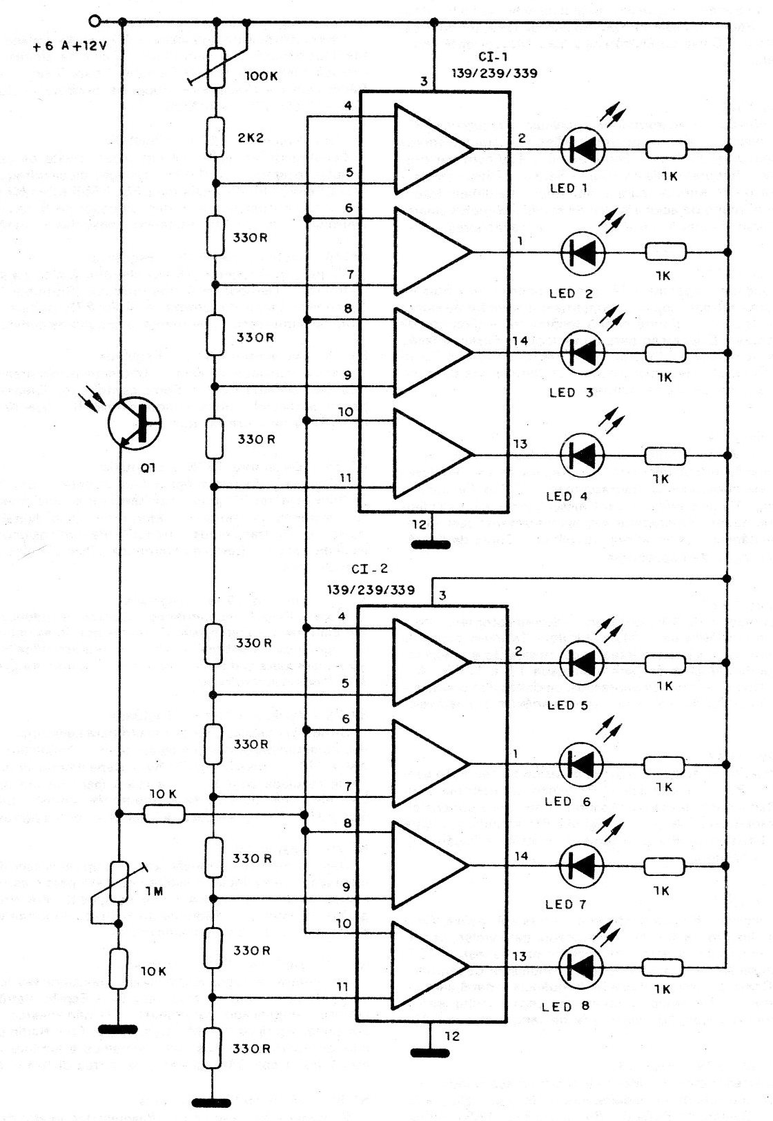 Una versión de ocho LED se puede hacer con la utilización de dos comparadores cuádruples, como se muestra en la figura 4.