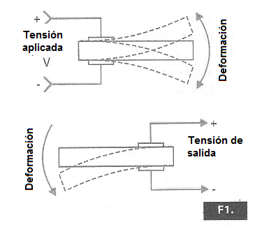 El hecho de que al haber aplicado una tensión una cerámica piezoeléctrica se deforma, y de la misma forma, al ser deformada, aparece en sus caras una tensión es bien conocida de todos los lectores, conforme muestra la figura 1.