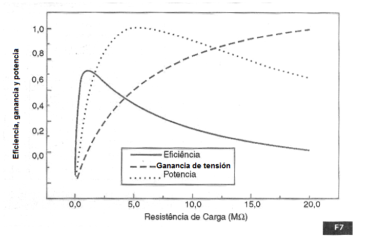 En la figura 7 mostramos un gráfico en el que tenemos la eficiencia en función de la resistencia de carga para un transformador típico de ese tipo.