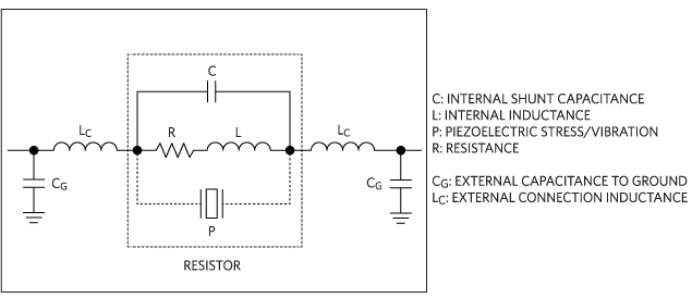 Además, el autor explora el circuito real de un resistor con sus elementos parásitos, mostrado en la figura siguiente.