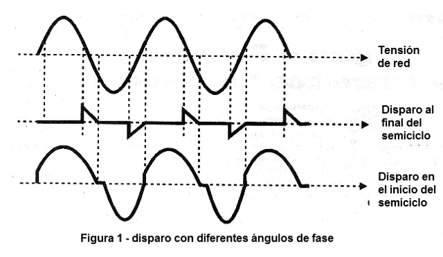 Así, si por una red de retardo disparar el TRIAC al final del semiciclo, la potencia aplicada a la carga será pequeña, y si disparamos al principio, la potencia será grande, vea en la figura 1.