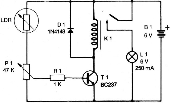 Cuando está iluminado, el LDR tiene su resistencia reducida de modo que una corriente más intensa puede circular. Esta corriente no puede disparar el relé directamente pero si es amplificada por el transistor logra el disparo.