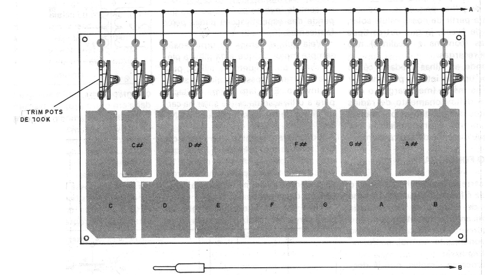 Para la versión de órgano conectamos en A el teclado formado por 7 a 12 trimpots y en B la punta de prueba que puede incluso ser hecha con un clavo grande.