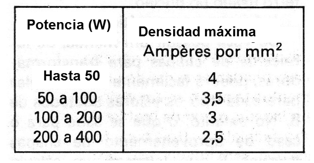 Podemos elaborar una tabla aproximada en la que la densidad de corriente máxima es determinada por la potencia del transformador: