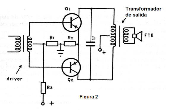 En la figura 2 tenemos entonces una etapa típica de salida de radio del tipo "push-pull" que lleva dos transistores iguales.
